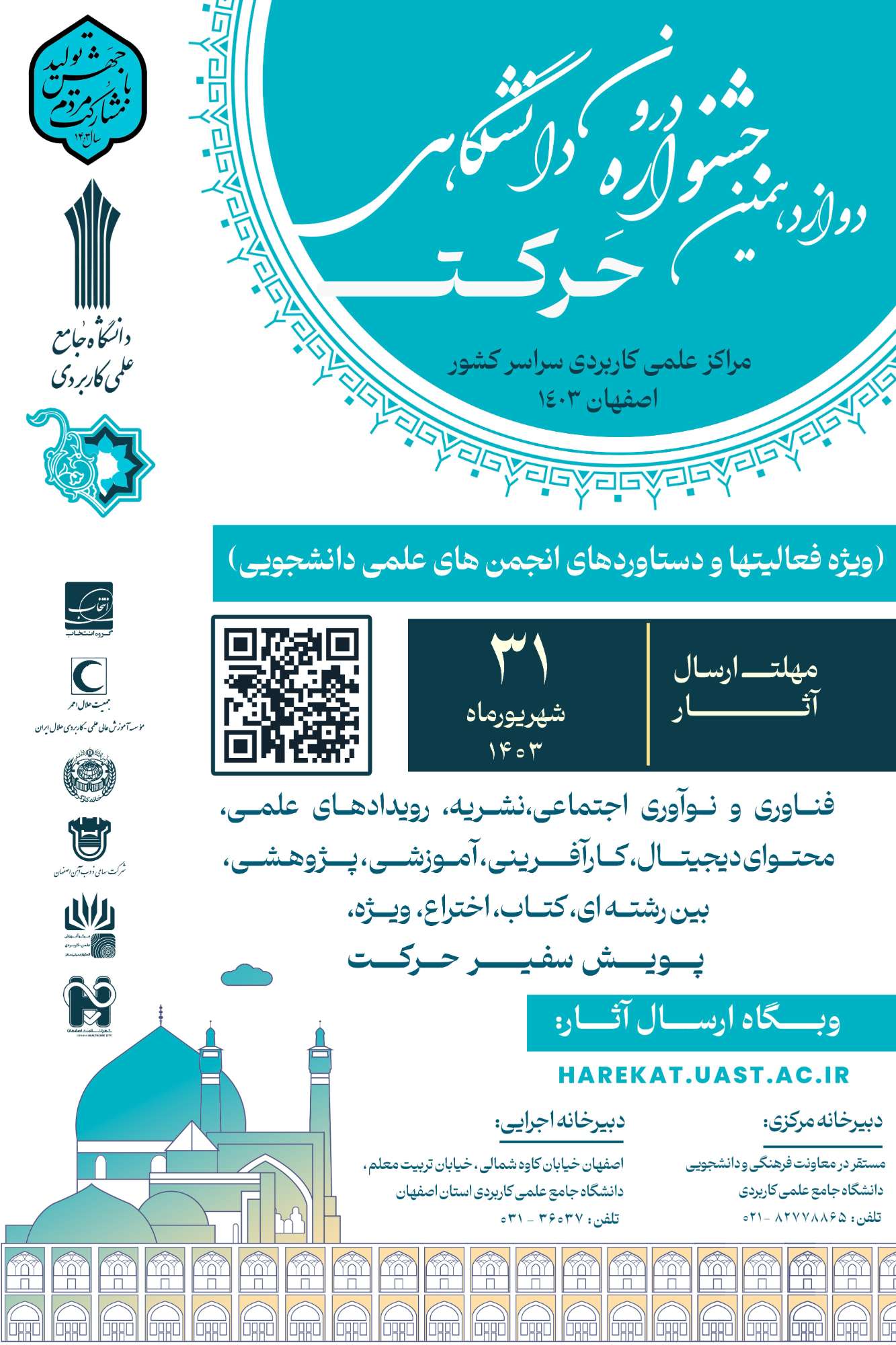 فراخوان دوازدهمین دوره جشنواره حرکت دانشگاه جامع علمی کاربردی ️از دانشجویان دعوت میشود تا آثار خود را در زمینههای کتاب با موضوع علمی (ترجمه یا تالیف) و اختراع که در بازه زمانی خرداد ۱۴۰۲ تا خرداد ۱۴۰۳ به ثبت رسیدهاند، برای شرکت در جشنواره حرکت دانشگاه جامع علمی کاربردی به بخش فرهنگی مرکز محل تحصیل خود ارسال نمایند. ️مهلت ارسال آثار: ۲۵ شهریور1403