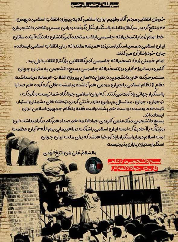 به همت بسیج دانشجویی مرکز 13 آبان سالروز تسخیر لانه جاسوسی و روز مبارزه با استکبار جهانی گرامی داشته شد. مسئولین بسیج دانشجویی با پخش شیرین در کلاس ها و توزیع بیانیه بسیج به مناسبت روز استکبارستیزی این روز را گرامی داشتند.